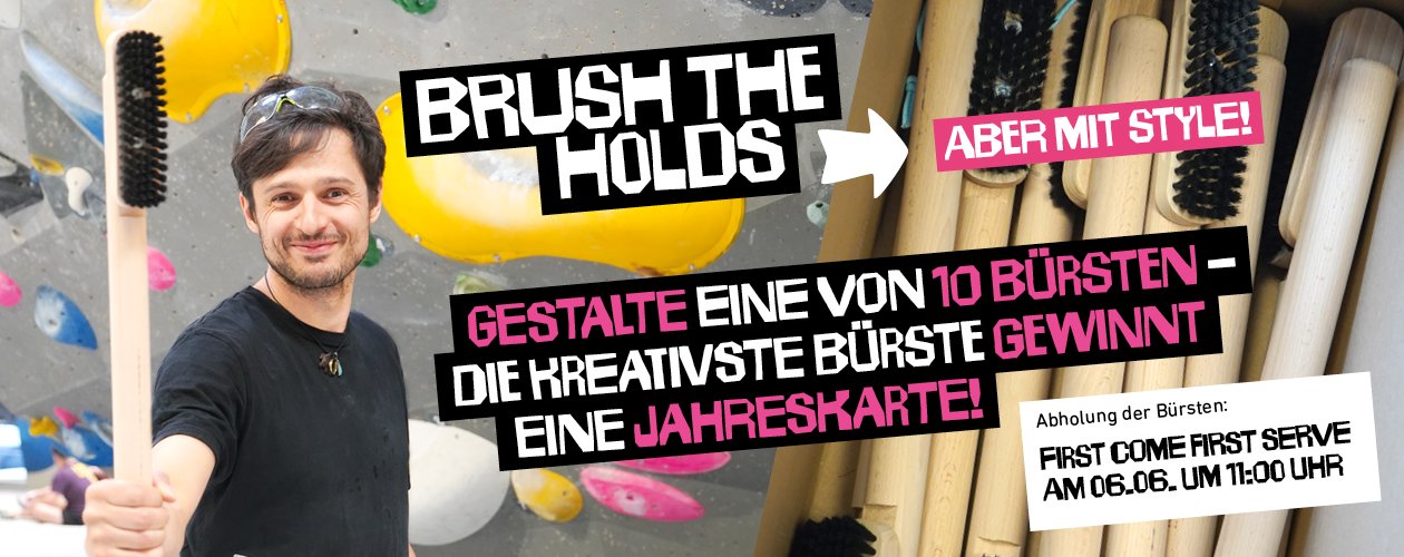 Saubere Griffe sind mehr als nur Optik: Sie sind die Basis für fairen Boulderspaß. Mit jedem Zug oder Tritt hinterlässt Du Chalk und Abrieb, der Reibung beeinflusst. „Brush your holds“ heißt Verantwortung übernehmen: Für Dich und alle anderen. Gemeinsam sorgen wir für bessere Bedingungen an der Wand. Mit dem Bürstencontest setzen wir bewusst ein Zeichen: gemeinsam Verantwortung übernehmen und das Bewusstsein für gepflegte Griffe stärken!